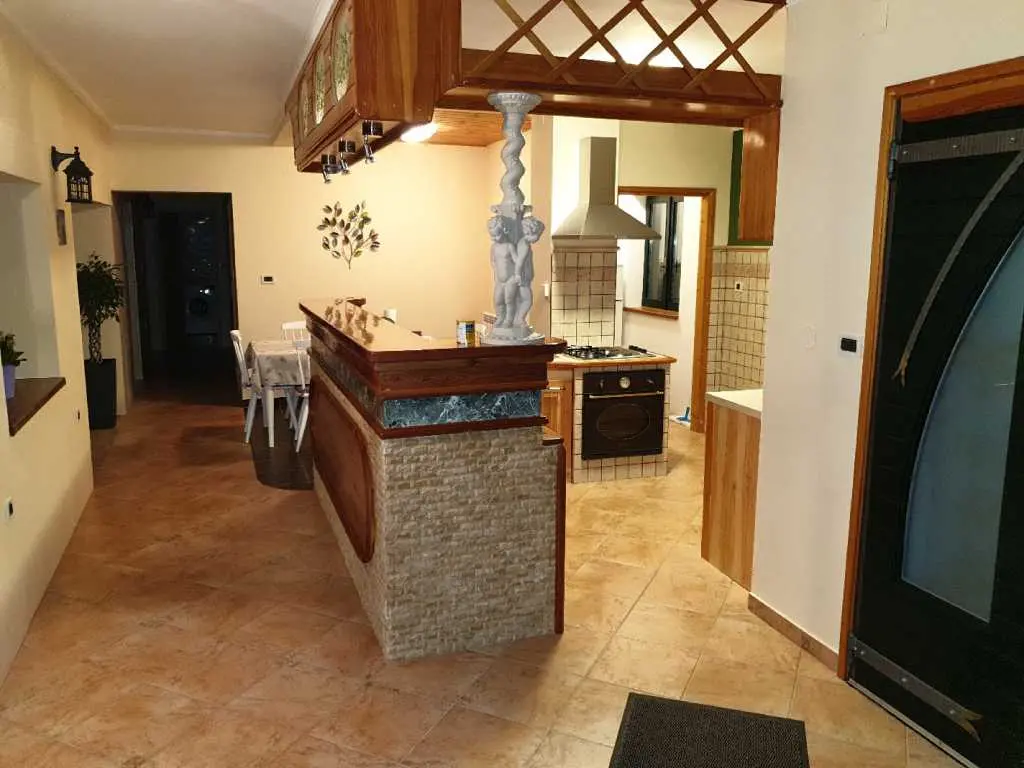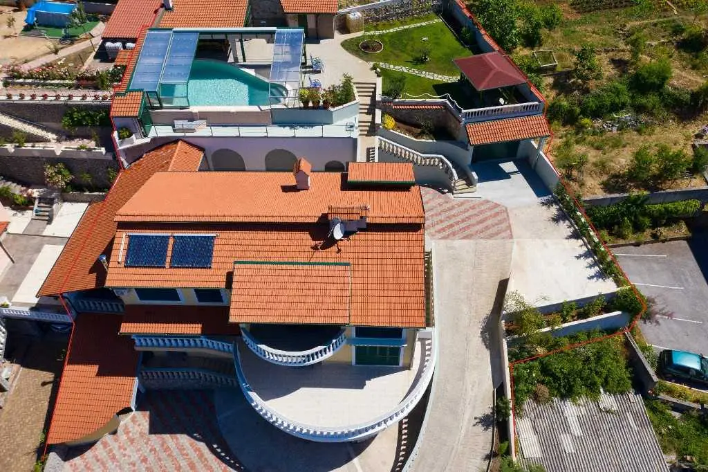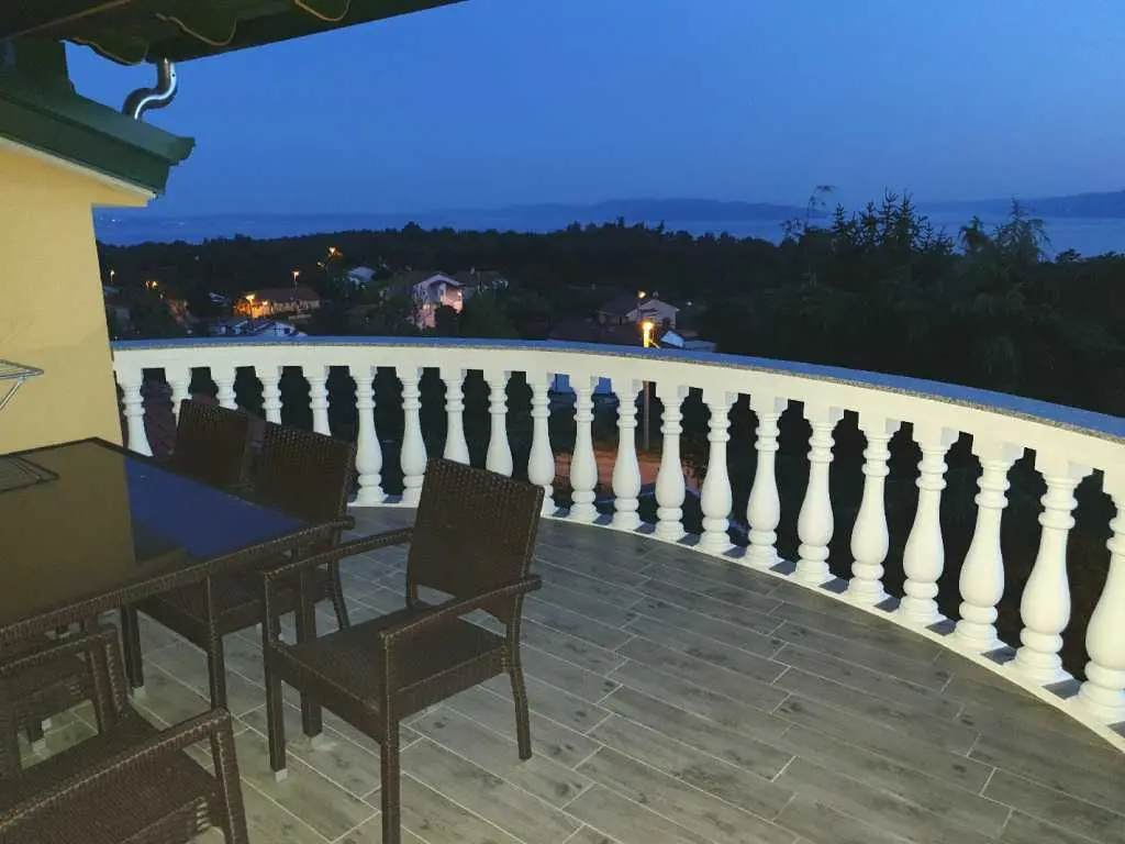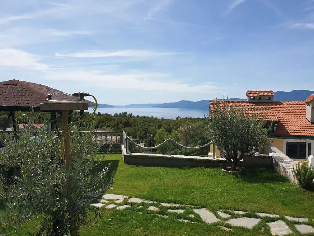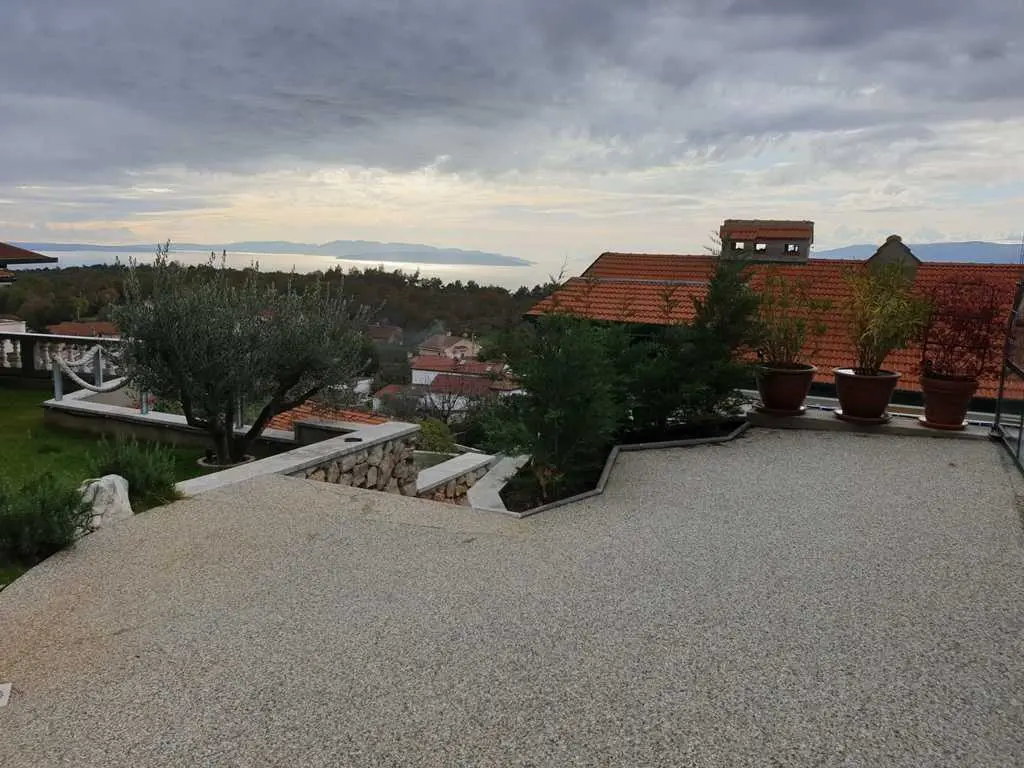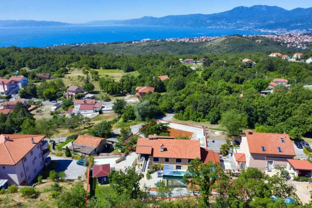 Villaen ligger på et rolig høytliggende sted, med vakker utsikt over hele Kvarnerbukta. Den består av et opphold i 2 etasjer med et samlet areal på 305m2. Hver etasje på sørsiden har en vakker terrasse med utsikt over havet. Huset har privat parkering for minst 5-6 biler. Det store svømmebassenget (60m3) ligger bak huset og tilbyr også en vakker utsikt over havet. Ved bassenget er det stor peis, hagekjøkken, kjøleskap, utendørs dusj, separat toalett, TV, musikk. Alt du trenger for å slappe helt av og kose deg. Husets underetasje består av 3 rom, bad og ekstra separat toalett, fullt utstyrt kjøkken, pantry, spisestue, stue. 155m2 med plass pluss en stor terrasse med utsikt. Øvre etasje består av 3 rom, 2 bad, utstyrt kjøkken, spisestue, stue og en terrasse med vakker havutsikt. Eiendommen har biljard, bordtennis, dart og treningsstudio