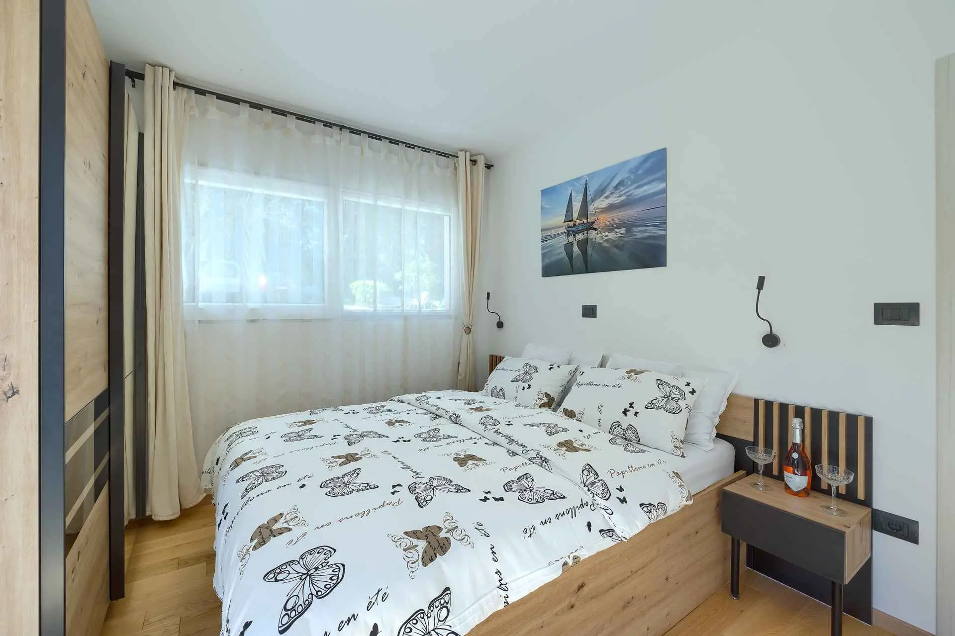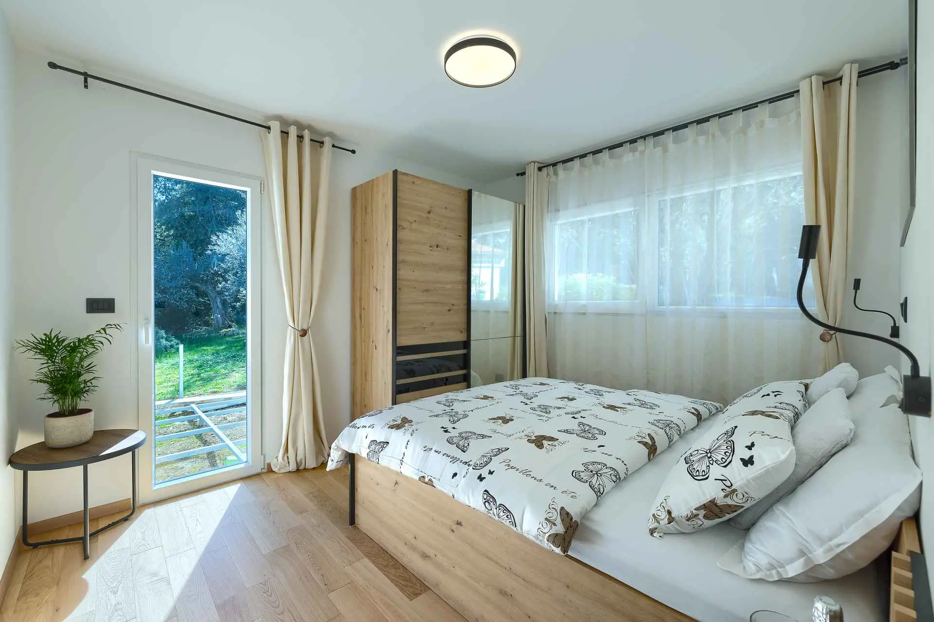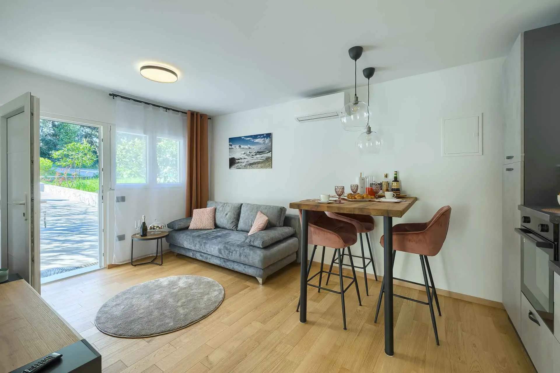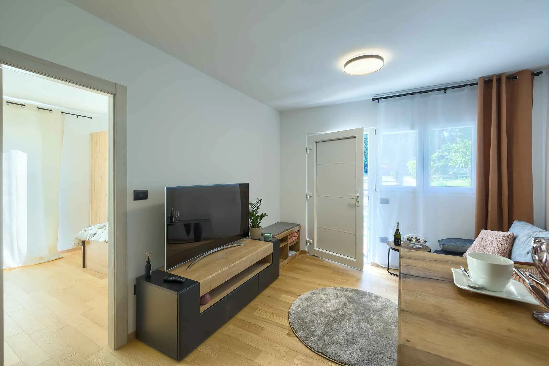 Nær sjøen, i en fantastisk beliggenhet ved siden av furuskogen, er det en fullt møblert leilighet Niko. Apartments tilbyr virkelig alt for en flott ferie i fullstendig fred og ro. Leiligheten er for to personer, og pluss en på sofaen i stuen. Moderne møbler, bestående av ett soverom med dobbeltseng, stue, spisestue, fullt utstyrt kjøkken, bad terrasse og 1 parkeringsplass. Leilighet med hele overflaten på 34m2. Dette rommet har klimaanlegg, plasma-TV og satellitt-TV. Leiligheten er innredet med materialer av høy kvalitet for å gjøre ferien så hyggelig. Stranden ligger mindre enn 100 meter unna og kan nås via sti gjennom furuskogen. Fra stranden kan du gå promenaden langs sjøen Banjole Simple - denne leiligheten har alt for en avslappende og idyllisk ferie ved sjøen!