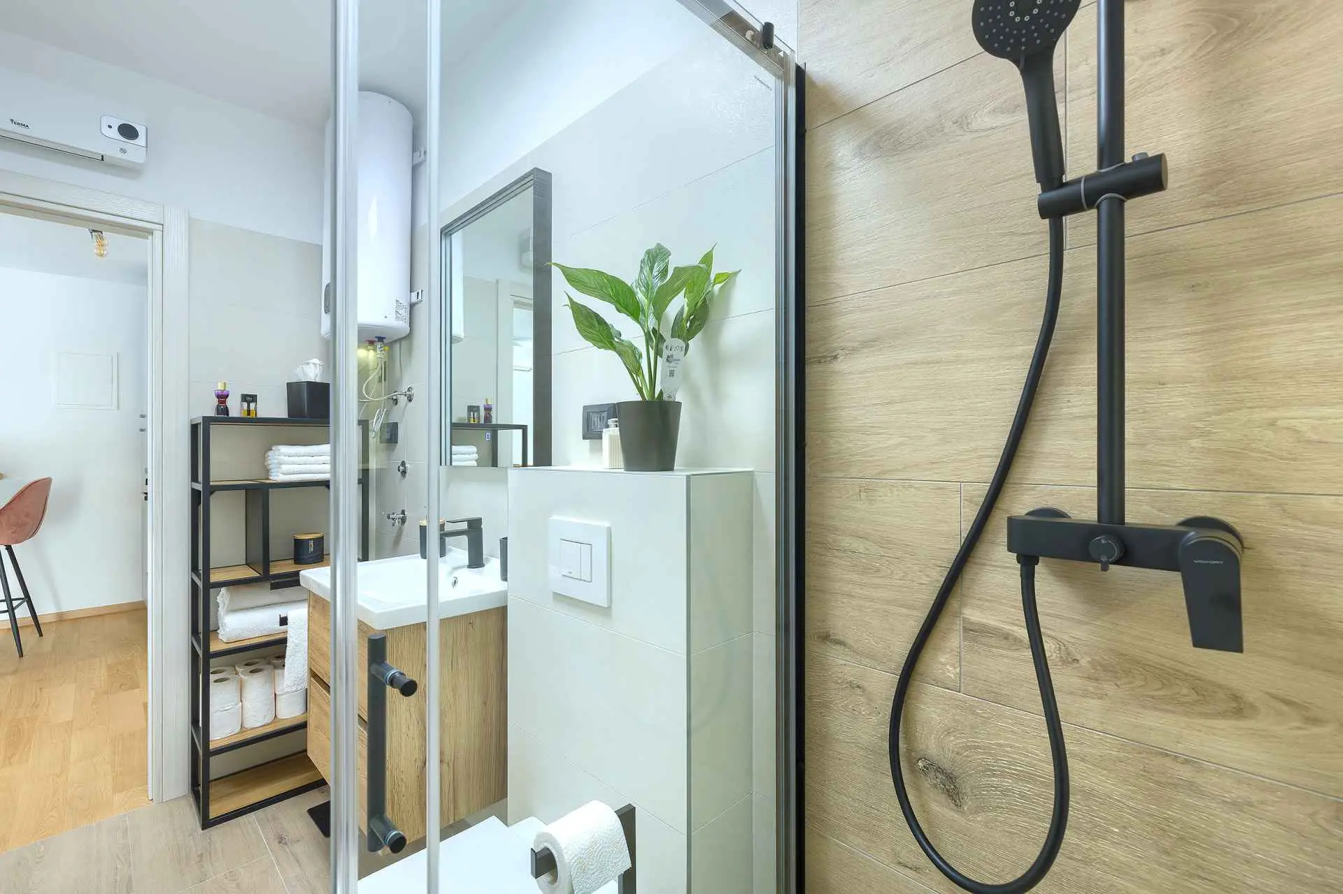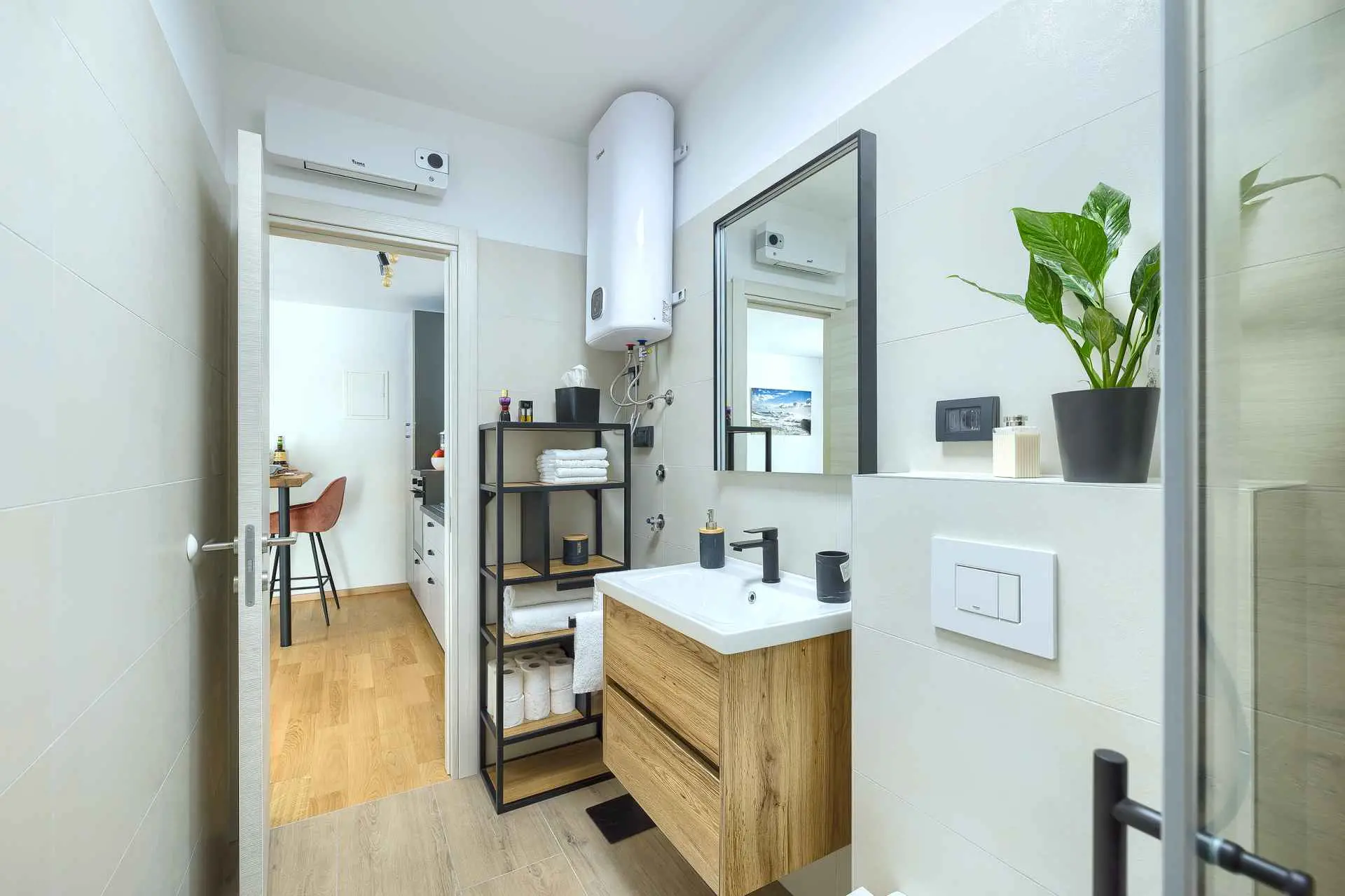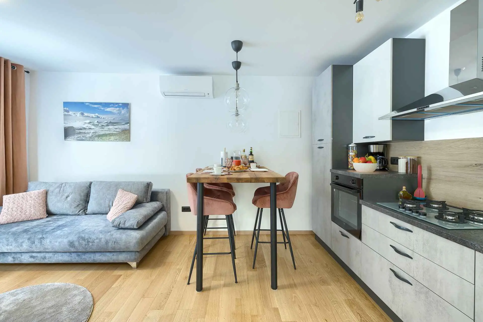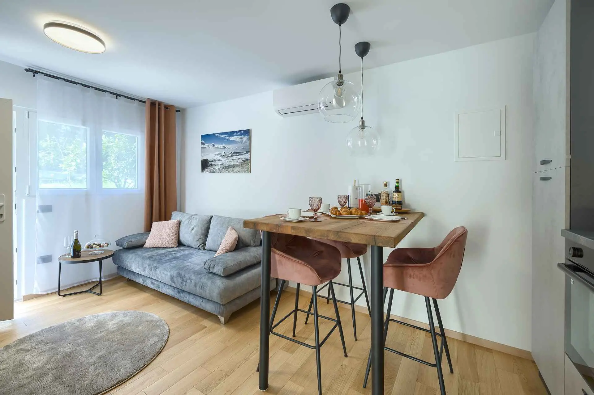 Nær sjøen, i en fantastisk beliggenhet ved siden av furuskogen, er det en fullt møblert leilighet Niko. Apartments tilbyr virkelig alt for en flott ferie i fullstendig fred og ro. Leiligheten er for to personer, og pluss en på sofaen i stuen. Moderne møbler, bestående av ett soverom med dobbeltseng, stue, spisestue, fullt utstyrt kjøkken, bad terrasse og 1 parkeringsplass. Leilighet med hele overflaten på 34m2. Dette rommet har klimaanlegg, plasma-TV og satellitt-TV. Leiligheten er innredet med materialer av høy kvalitet for å gjøre ferien så hyggelig. Stranden ligger mindre enn 100 meter unna og kan nås via sti gjennom furuskogen. Fra stranden kan du gå promenaden langs sjøen Banjole Simple - denne leiligheten har alt for en avslappende og idyllisk ferie ved sjøen!