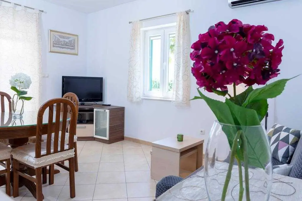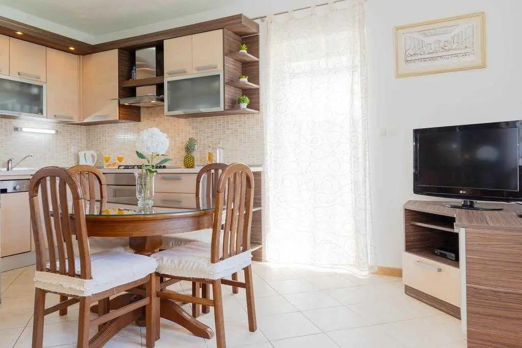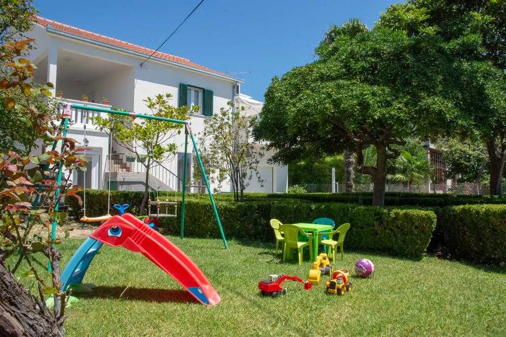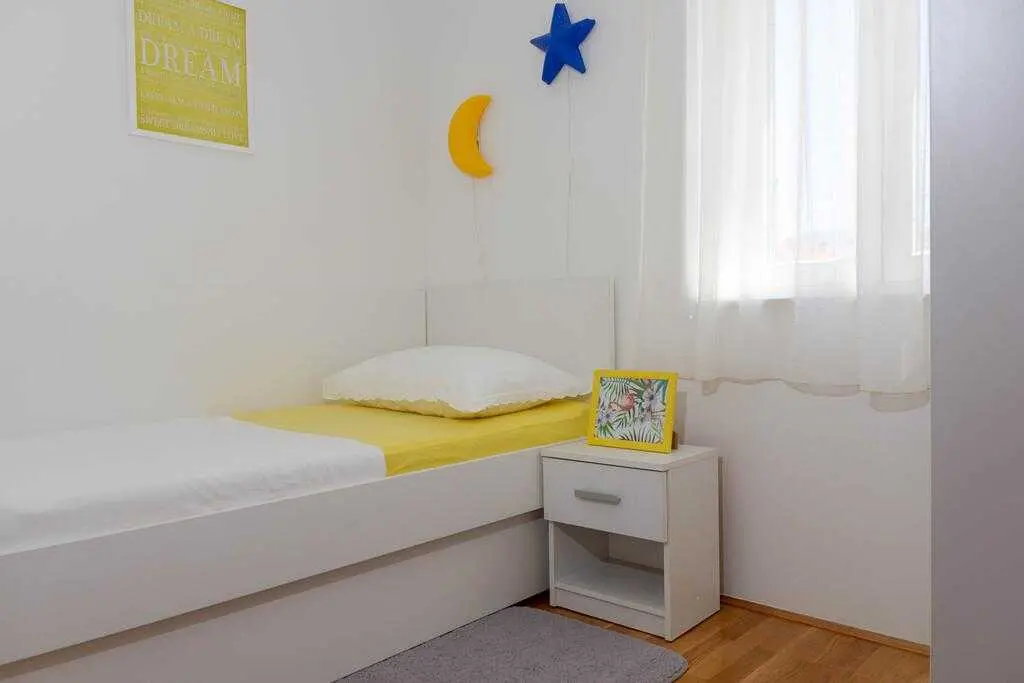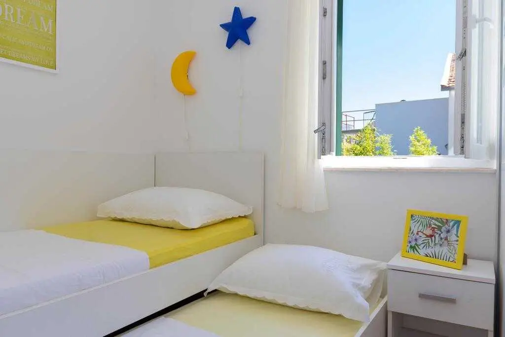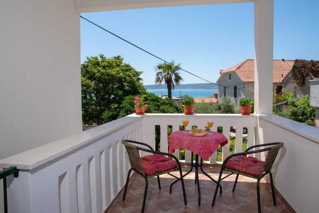 Leilighet Šimera (55m2 for maks 5 personer), et fint feriehus ligger i et lite og rolig sted Kaštel Štafilić mellom Trogir og Split, omgitt av familiehus og er ideelt for familier og par som leter etter fred og ro. Bare 30 meter fra sjøen og 2 minutters gange til nærmeste rullesteinstrand, tilbyr det klimaanlegg, kabel-TV, gratis Wi-Fi og en utendørs grill med hagemøbler. Huset strekker seg gjennom første etasje hvor det er et vaskerom og garasje i denne første etasje forbundet med utvendige trapper. Fra terrassen er det delvis utsikt over havet og landskapet. I hagen, bak huset, er lekeplassen tilrettelagt for de yngste besøkende. Leiligheten har balkong, to soverom, romslig stue, kjøkken med kokemuligheter, oppvaskmaskin, vaskemaskin og tørketrommel, vannkoker, stekeovn og eget bad. I nærheten av leilighetene har du alt du trenger: strand, pizzeria, restaurant-taverne, gatekjøkken, marked, supermarked, postkontor, bank, apotek, lekeplass for barn, kafébarer ...