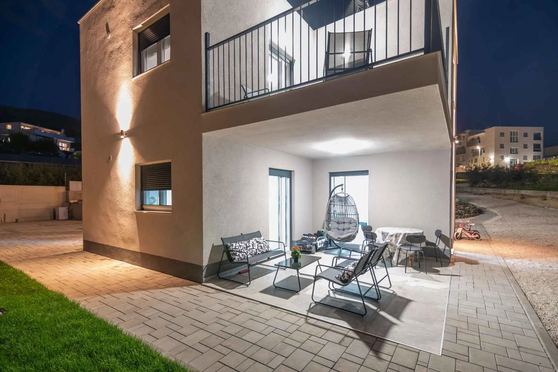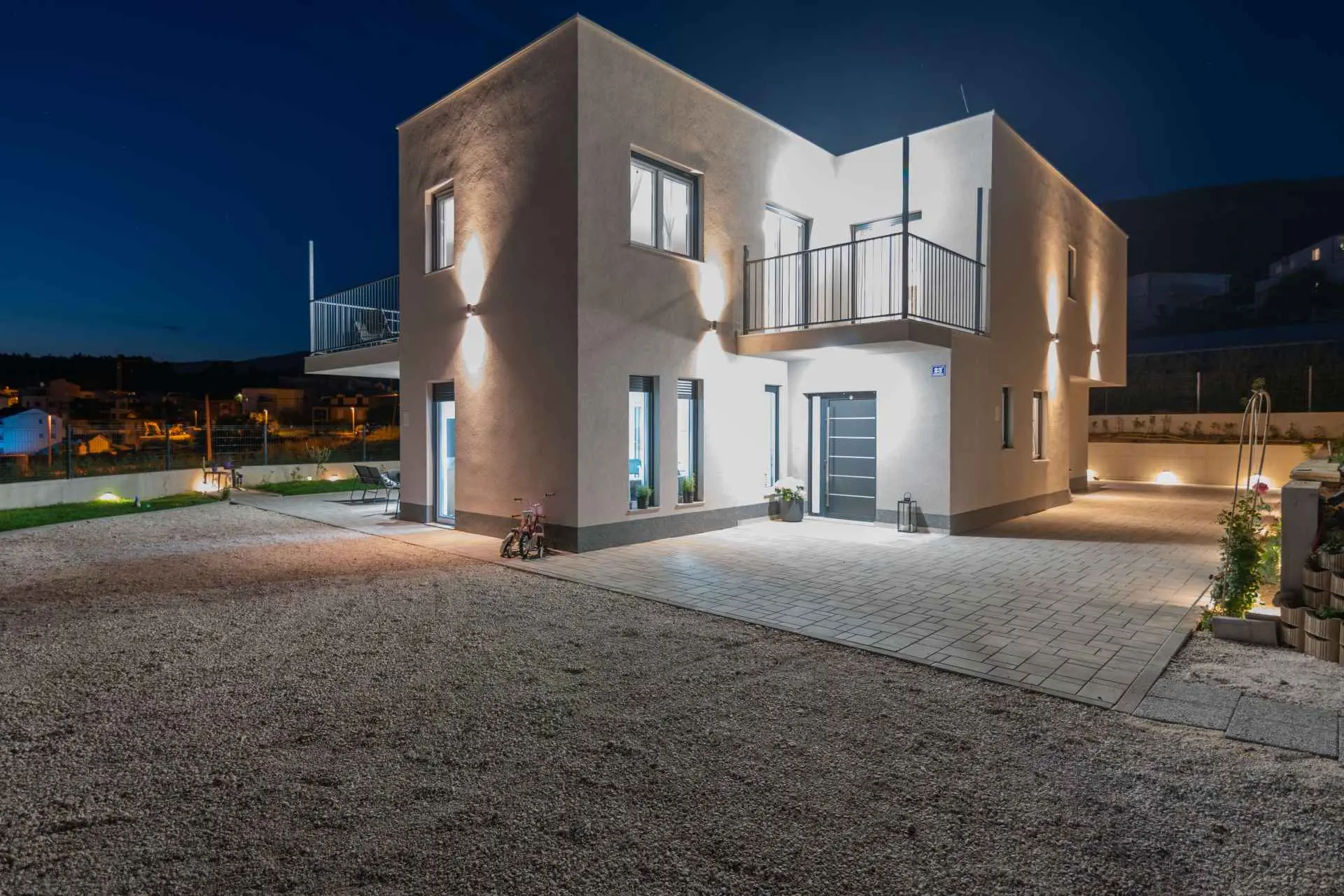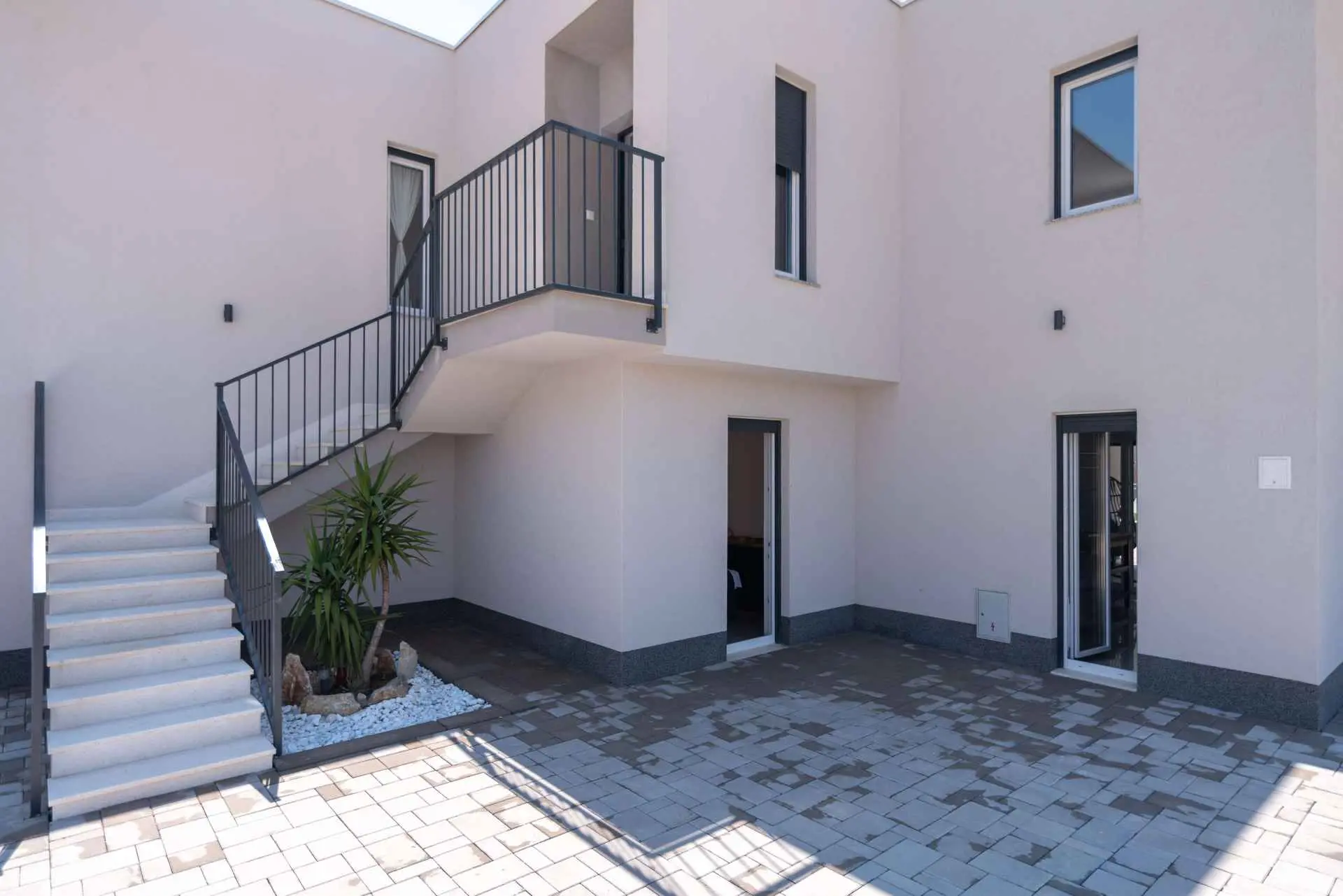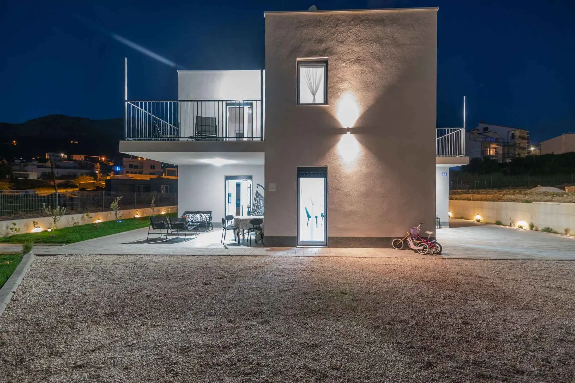 Nyt en ferie med familien i dette fullt utstyrte moderne hjemmet med uteplass og bakgård. Det nybygde huset ligger i en rolig og romslig landsby med vakker utsikt, 200 meter fra sjøen. I den romslige bakgården kan barna nyte det grønne gresset, svinge eller hoppe på trampolinen. For de eldre er det en terrasse hvor du kan se vakre solnedganger og hvile. Gjestene kan bruke sommerkjøkkenet hvor du kan grille og holde deg i frisk luft. Plassen Gjestene har tilgang til første etasje og første etasje. Hver etasje er fullt innredet med kjøkken, spisestue, stue. Det er også vaskerom, rom med eget bad, gjestetoalett... Leilighet i første etasje: Har plass til 4 voksne + 2 barn på en ekstra seng. Den har et fullt utstyrt kjøkken, spisestue, stue og 2 soverom med eget bad og ett gjestetoalett. Gjestene har tilgang til et vaskerom i et separat rom, et strykejern og et strykebrett. Leilighet i andre etasje: Leiligheten ligger i første etasje. Inngang til oppføringen via trapp på utsiden. Den har plass til 4 personer. Den har et fullt utstyrt kjøkken, spisestue, stue og 2 soverom med eget bad og ett gjestetoalett. Gjestene har tilgang til et vaskerom i et separat rom, et strykejern og et strykebrett. ✓ Smart TV ✓ WIFI ✓ Elektriske rulleskodder ✓ Aircondition i rom og spisestue ✓ Trygg Avstanden til nærmeste strand er 600m fra huset eller 7 minutter lett gange. På stranden kan du komme over en håndfull serveringssteder. I sommermånedene er det ulike fasiliteter som utflukter til de omkringliggende øyene, massasjer med utsikt over havet og adrenalinsport. Hvis du kommer på ferie uten personlig bil, har du ingen bekymringer fordi den nærmeste busstasjonen ligger 450 meter fra huset, det vil si en 6-minutters lett gange. Du kan ta buss til stedet på vei til Split eller Omis. En taxi er også tilgjengelig. I nærheten av huset er det en liten lokal butikk 220m eller 3 minutters gange unna. Det er også en større butikk 500 meter unna (7 minutters gange fra huset). Avstand fra viktigere steder: • Diokletians palass - 10,3 km • Split fergehavn - 10,6 km • Bačvice-stranden - 10,0 km • Marjan Park Viewpoint - 13,1 km • Žnjan - 9,0 km • Split lufthavn - 30,5 km