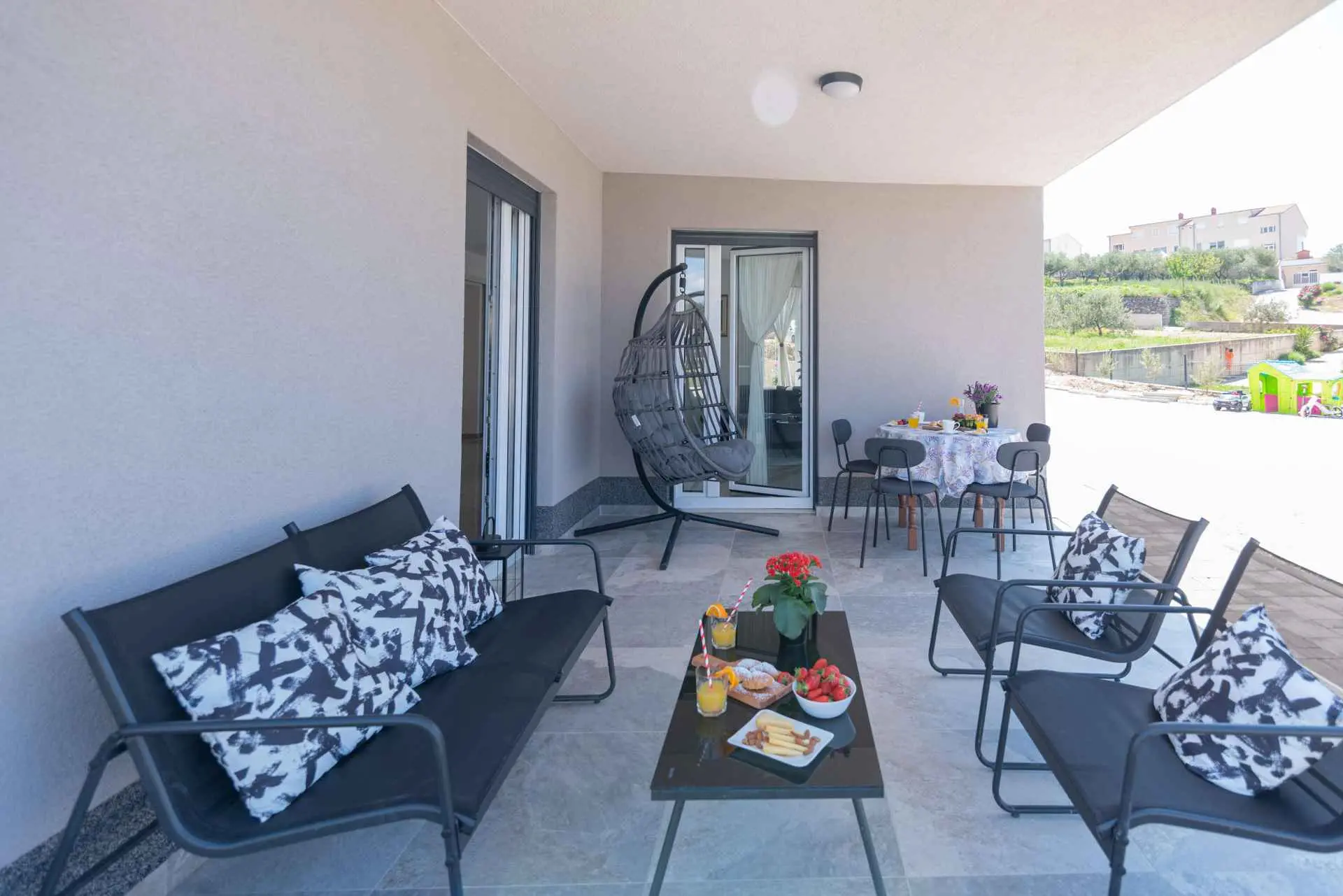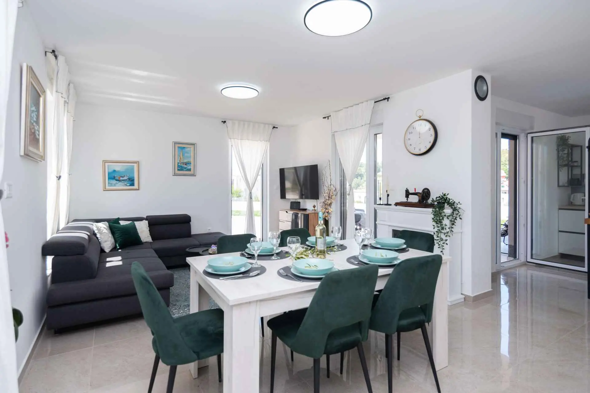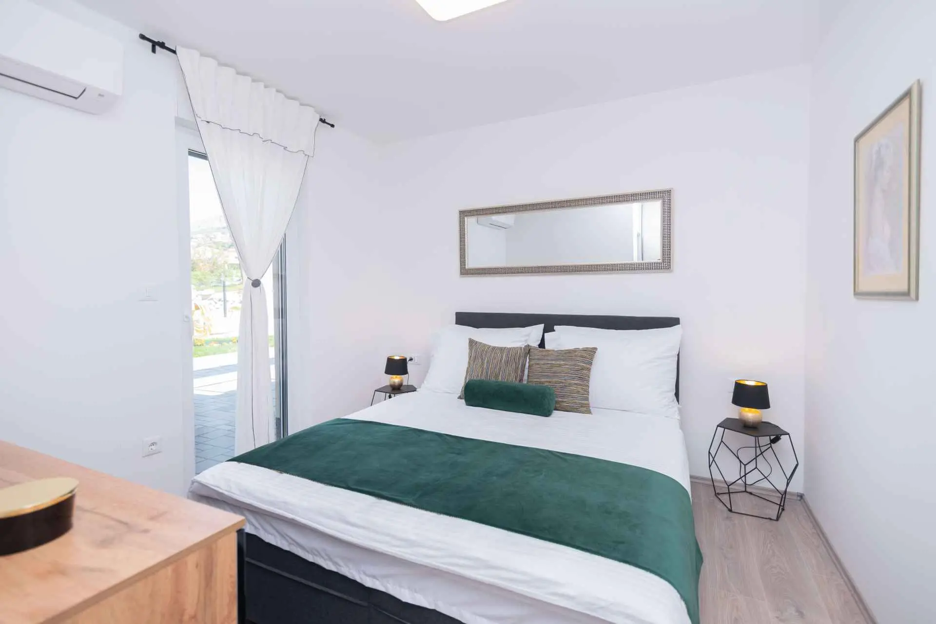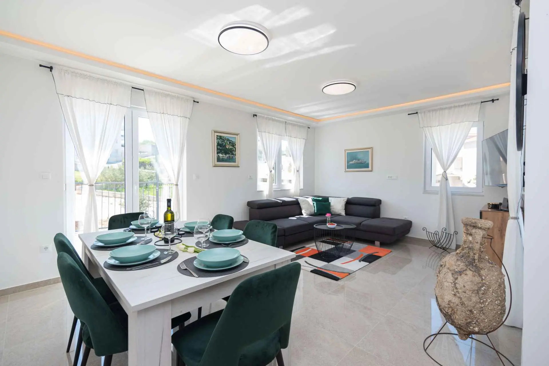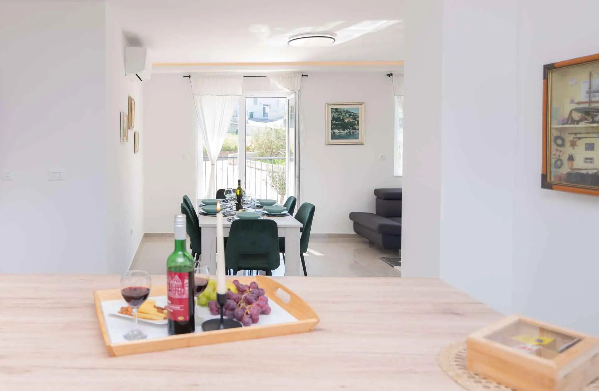 Nyt en ferie med familien i dette fullt utstyrte moderne hjemmet med uteplass og bakgård. Det nybygde huset ligger i en rolig og romslig landsby med vakker utsikt, 200 meter fra sjøen. I den romslige bakgården kan barna nyte det grønne gresset, svinge eller hoppe på trampolinen. For de eldre er det en terrasse hvor du kan se vakre solnedganger og hvile. Gjestene kan bruke sommerkjøkkenet hvor du kan grille og holde deg i frisk luft. Plassen Gjestene har tilgang til første etasje og første etasje. Hver etasje er fullt innredet med kjøkken, spisestue, stue. Det er også vaskerom, rom med eget bad, gjestetoalett... Leilighet i første etasje: Har plass til 4 voksne + 2 barn på en ekstra seng. Den har et fullt utstyrt kjøkken, spisestue, stue og 2 soverom med eget bad og ett gjestetoalett. Gjestene har tilgang til et vaskerom i et separat rom, et strykejern og et strykebrett. Leilighet i andre etasje: Leiligheten ligger i første etasje. Inngang til oppføringen via trapp på utsiden. Den har plass til 4 personer. Den har et fullt utstyrt kjøkken, spisestue, stue og 2 soverom med eget bad og ett gjestetoalett. Gjestene har tilgang til et vaskerom i et separat rom, et strykejern og et strykebrett. ✓ Smart TV ✓ WIFI ✓ Elektriske rulleskodder ✓ Aircondition i rom og spisestue ✓ Trygg Avstanden til nærmeste strand er 600m fra huset eller 7 minutter lett gange. På stranden kan du komme over en håndfull serveringssteder. I sommermånedene er det ulike fasiliteter som utflukter til de omkringliggende øyene, massasjer med utsikt over havet og adrenalinsport. Hvis du kommer på ferie uten personlig bil, har du ingen bekymringer fordi den nærmeste busstasjonen ligger 450 meter fra huset, det vil si en 6-minutters lett gange. Du kan ta buss til stedet på vei til Split eller Omis. En taxi er også tilgjengelig. I nærheten av huset er det en liten lokal butikk 220m eller 3 minutters gange unna. Det er også en større butikk 500 meter unna (7 minutters gange fra huset). Avstand fra viktigere steder: • Diokletians palass - 10,3 km • Split fergehavn - 10,6 km • Bačvice-stranden - 10,0 km • Marjan Park Viewpoint - 13,1 km • Žnjan - 9,0 km • Split lufthavn - 30,5 km